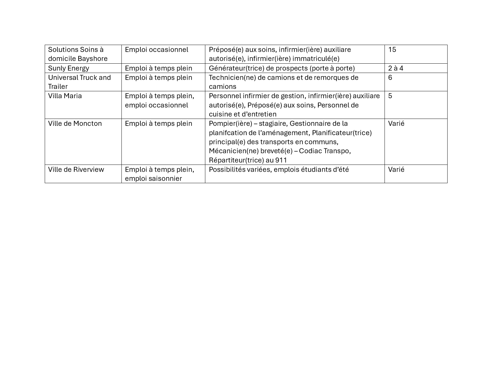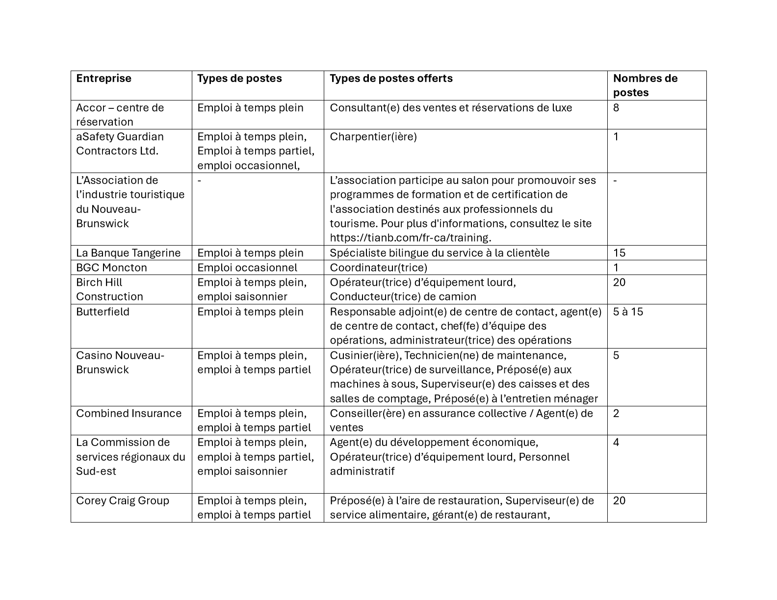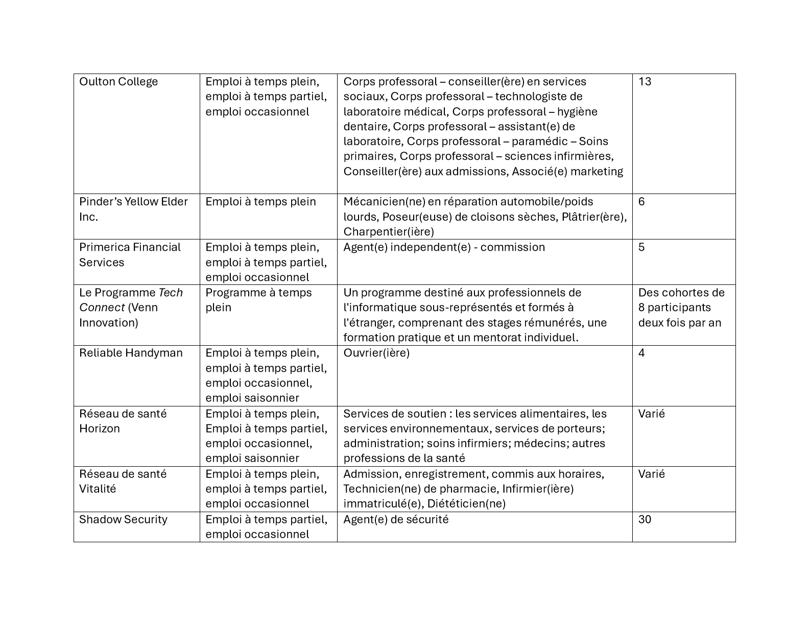 Veuillez consulter ci-dessous la liste des employeurs participants et les postes disponibles.
